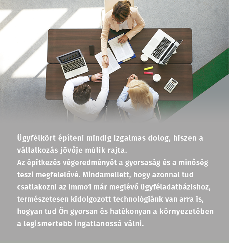 A hatalmas induló adatbázis sokat érhet, önmagában azonban nem megoldás. Mi hiszünk abban, hogy az ügyfelek bizalma a legfontosabb és a bizalom alapja a pozitív ismertség. Bizalmat építeni alapos, tervezett munkával lehet. Az Immo1 kidolgozott módszerei alkalmasak arra, hogy a jó hírnév megőrzése mellett a lehető legtöbben és a leggyorsabban megismerjék az ön vállalkozását abban a lokációban, ahonnan az ön jövedelme származik. A hitvallásunk szerint, ha valaki reggel arra ébred, hogy ingatlant akar eladni, vagy venni, akkor az Immo1 jusson az eszébe.